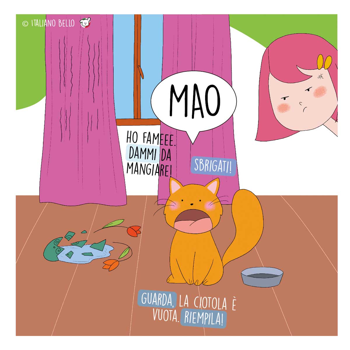 Mao! Ho fameee! Dammi da mangiare! / Sbrigati! / Guarda, la ciotola è vuota. Riempila!